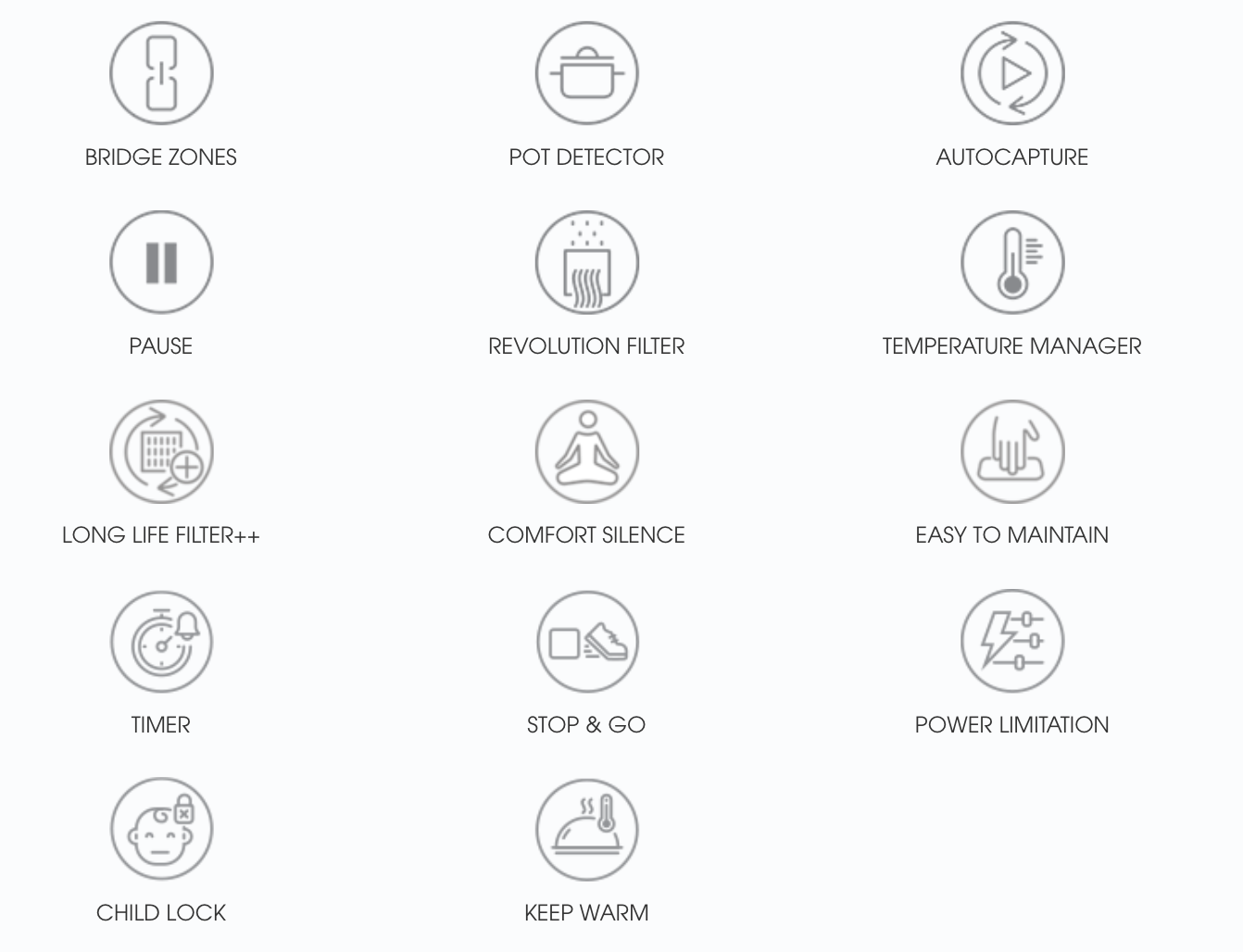 - BRIDGE ZONES: Chức năng ghép hai vùng nấu thành một vùng lớn hơn với cùng một công suất, nhiệt độ đồng đều cho kết quả tốt nhất.