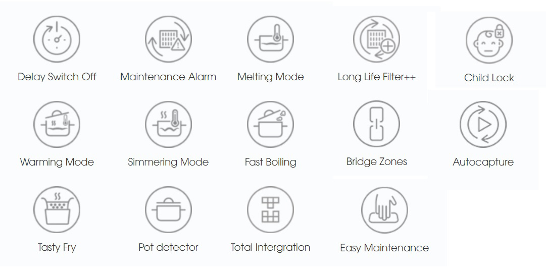 - Autocapture: Máy hút mùi sẽ xác định các vùng nấu đang hoạt động và cài đặt công suất phù hợp, giảm dần tốc độ, loại bỏ khói và mùi còn sót lại khi nấu xong.