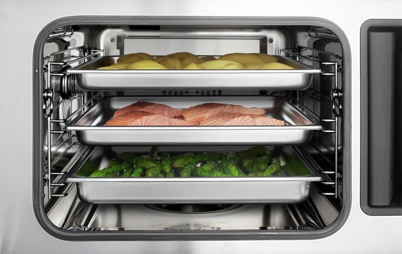 Thực phẩm nấu chín bằng hơi nước không chỉ ngon – ngọt, tốt cho sức khỏe mà còn giữ trọn hương vị, vitamin và khoáng chất. Điều đặc biệt nữa là bạn có thể nấu ăn ở cả ba vị trí đặt khay cùng một lúc mà mùi các món ăn không bị pha trộn vào nhau. Và thêm một điểm cộng nữa cho Lò hấp BOSCH CDG634AS0|Serie 8 là có bồn chứa nước tích hợp sẵn, không cần kết nối nguồn nước trực tiếp.