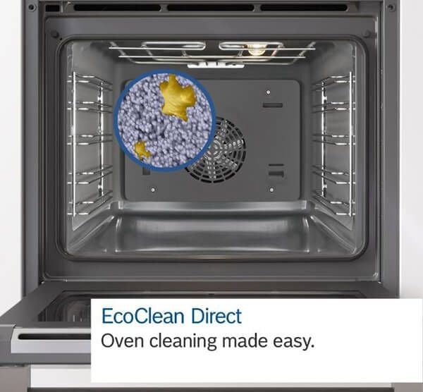 - Mặt sau lò được phủ lớp EcoClean Direct đặc biệt, có khả năng tự động hấp thụ dầu mỡ và phân hủy chúng trong quá trình nướng.