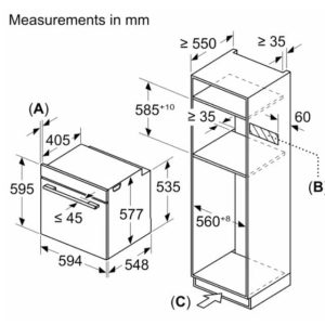 - Kích thước lắp đặt tối thiểu (Cao x Rộng x Sâu): 585 x 560 x 550 mm