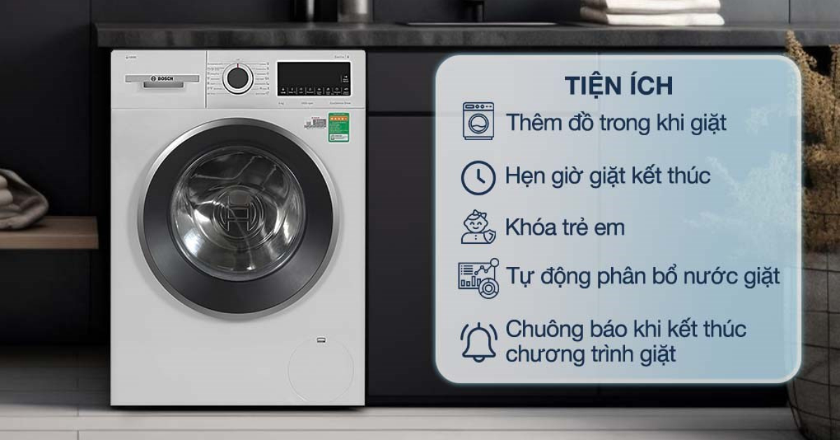 MÁY GIẶT BOSCH SERIE 6 WGG244A0SG I-DOS 9KG là sản phẩm đến từ thương hiệu Bosch danh tiếng của Đức, được sản xuất theo công nghệ hiện đại, mang đến hiệu quả giặt giũ vượt trội và trải nghiệm đẳng cấp cho người dùng. Sản phẩm sở hữu nhiều tính năng thông minh như ActiveWater Plus, VarioDrum, i-DOS, VarioPerfect, cùng động cơ EcoSilence Drive mạnh mẽ và bền bỉ, giúp tiết kiệm nước, điện năng và hoạt động êm ái.