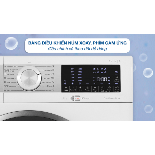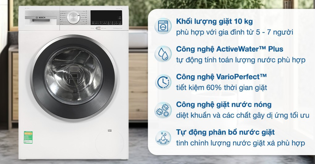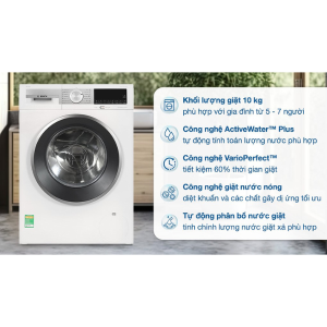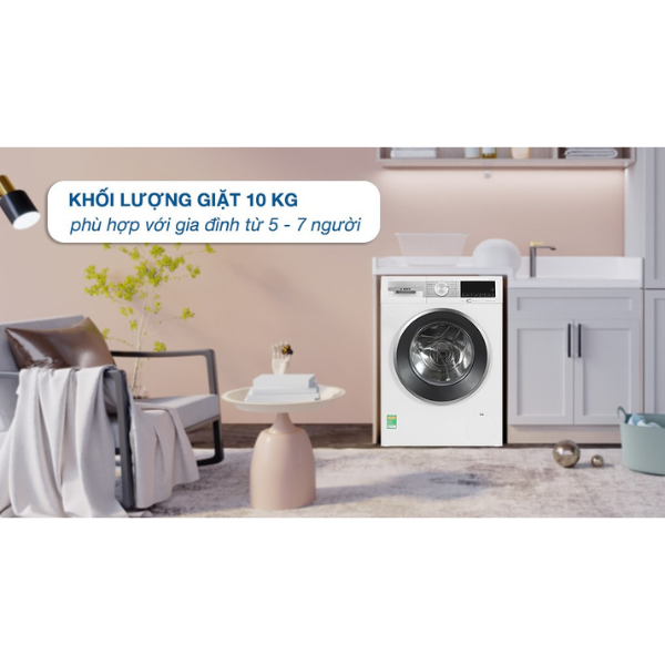 Khối lượng giặt 10kg, đáp ứng nhu cầu gia đình đông người: Với khối lượng giặt 10kg, máy giặt Bosch WGG254A0SG đáp ứng tốt nhu cầu giặt giũ cho gia đình từ 5-6 thành viên.