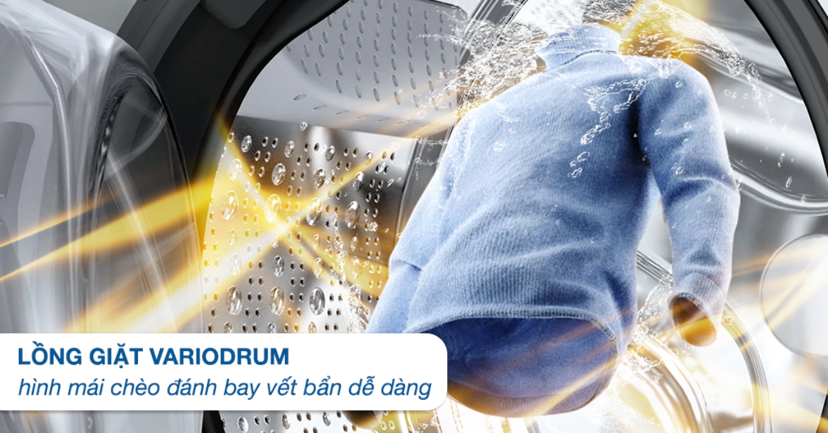 Công nghệ VarioDrum và VarioSoft bảo vệ quần áo tối ưu: Công nghệ lồng giặt VarioDrum với thiết kế dạng sóng độc đáo, kết hợp cùng tính năng VarioSoft giúp phân bổ nước đều, cân đối, bảo vệ mọi loại vải ở điều kiện tốt nhất, không bị ảnh hưởng trong quá trình giặt.
