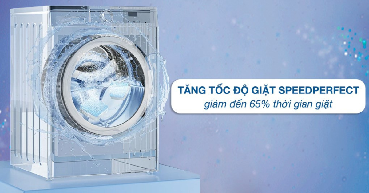 Công nghệ SpeedPerfect tiết kiệm thời gian: Rút ngắn thời gian giặt lên đến 65% mà vẫn đảm bảo hiệu quả làm sạch tối ưu, giúp bạn tiết kiệm thời gian cho những công việc khác.