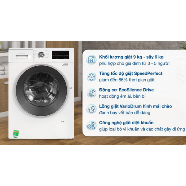 Thiết kế hiện đại, tiện lợi: Kiểu dáng độc lập với gam màu trắng trang nhã, dễ dàng lắp đặt và phù hợp với mọi không gian nội thất. Khối lượng giặt 9kg và sấy 6kg đáp ứng nhu cầu của gia đình từ 3-5 thành viên.