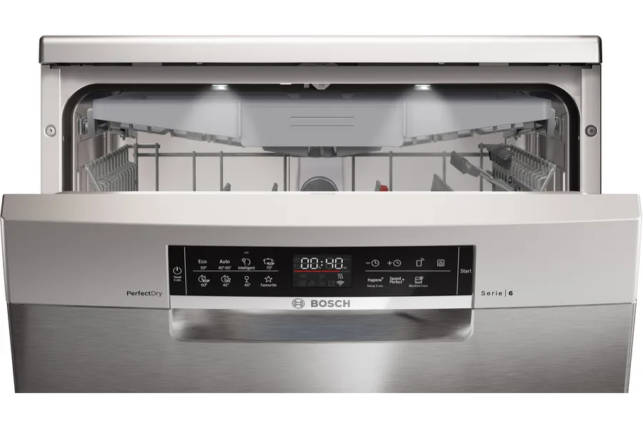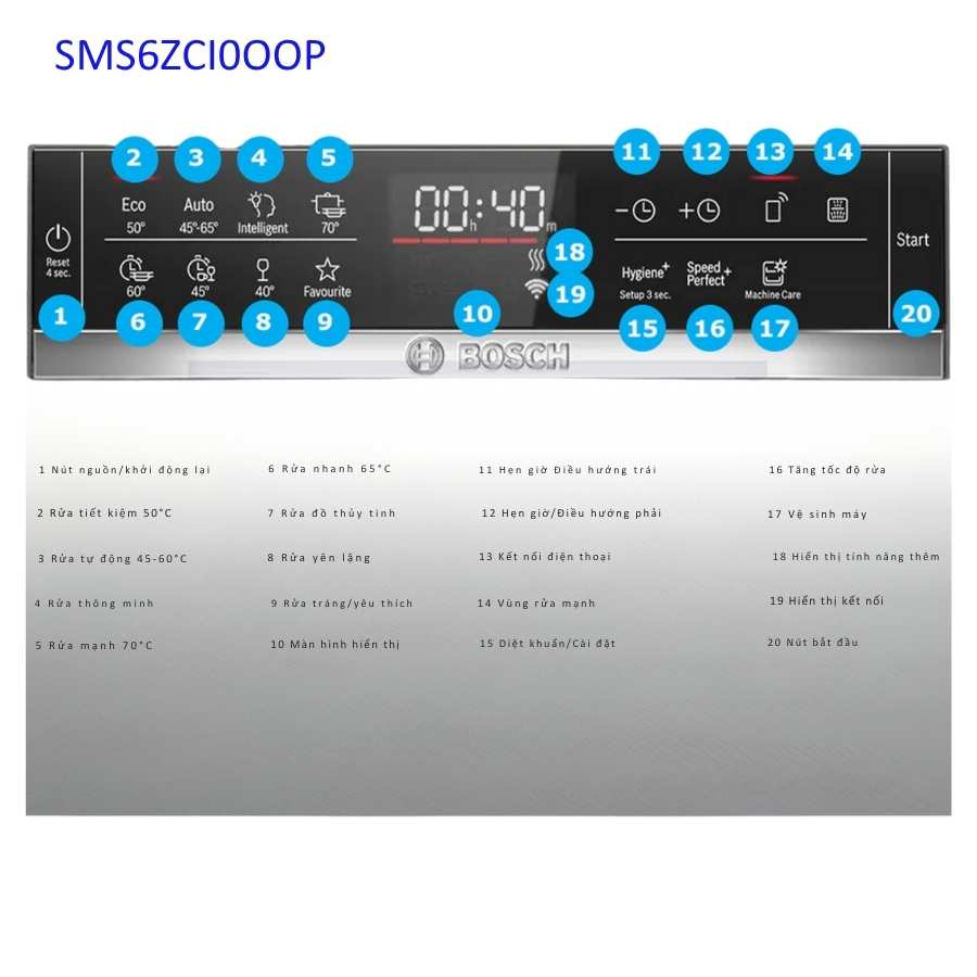 - Diệt khuẩn (Sanitization): Máy rửa chén Bosch SMS6ZCI00P tích hợp chương trình rửa chuyên sâu sử dụng nhiệt độ cao để tiêu diệt vi khuẩn, đảm bảo an toàn vệ sinh cho đồ dùng ăn uống của gia đình.