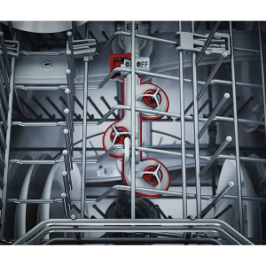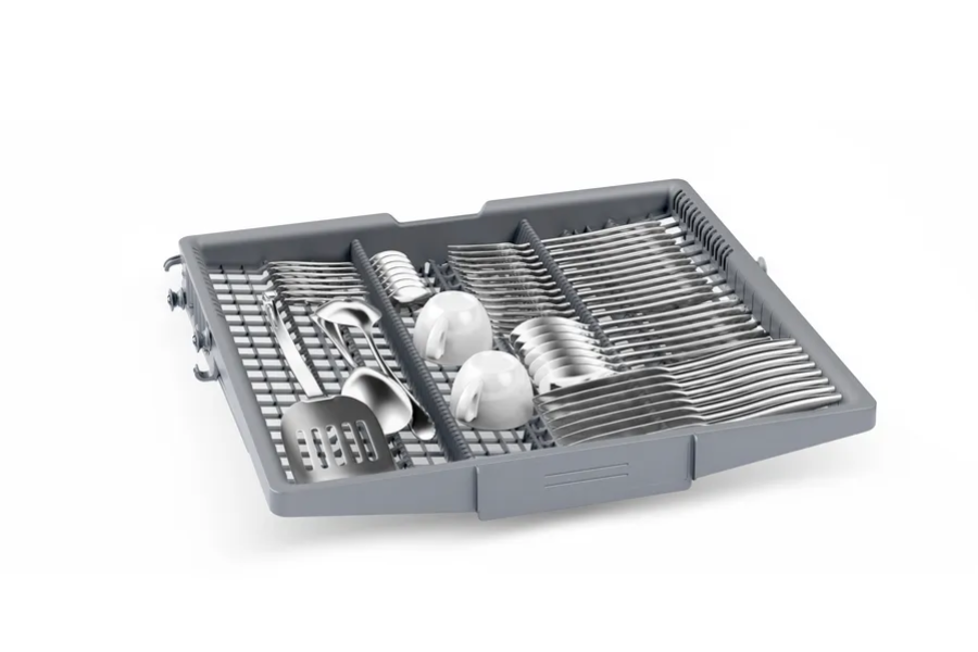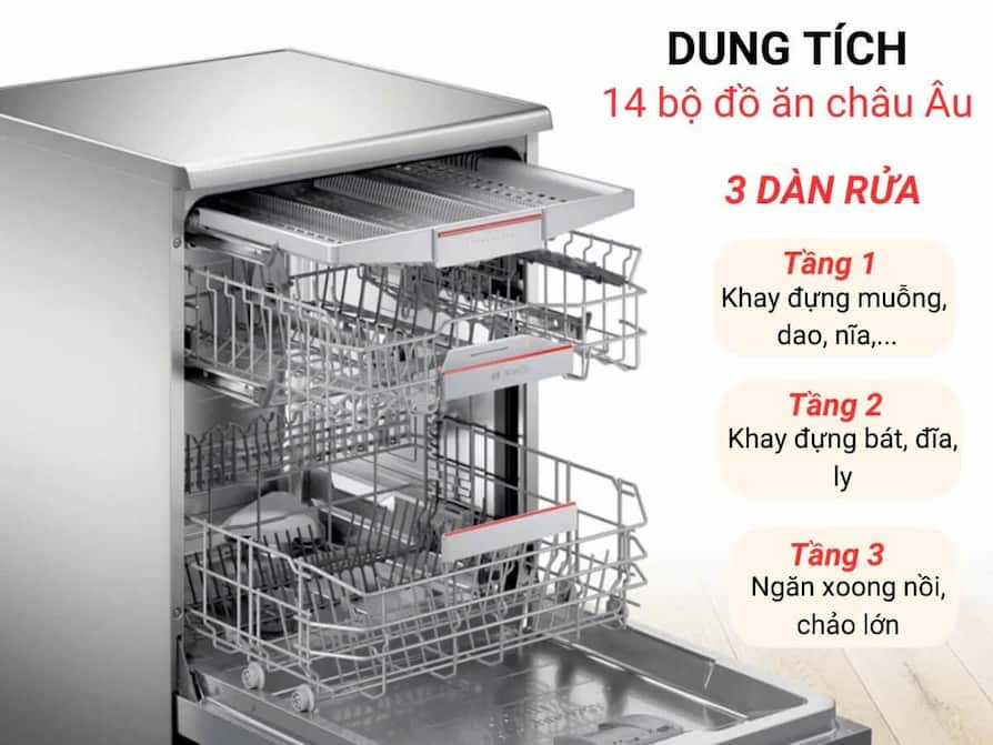 - Máy có thể chứa đến 14 bộ đồ ăn tiêu chuẩn châu Âu, đáp ứng nhu cầu cho gia đình từ 4–6 người. Khoang chứa rộng rãi, linh hoạt điều chỉnh ngăn đựng dao, dĩa và khay đựng ly, phù hợp với nhiều loại bát đĩa kích thước khác nhau.